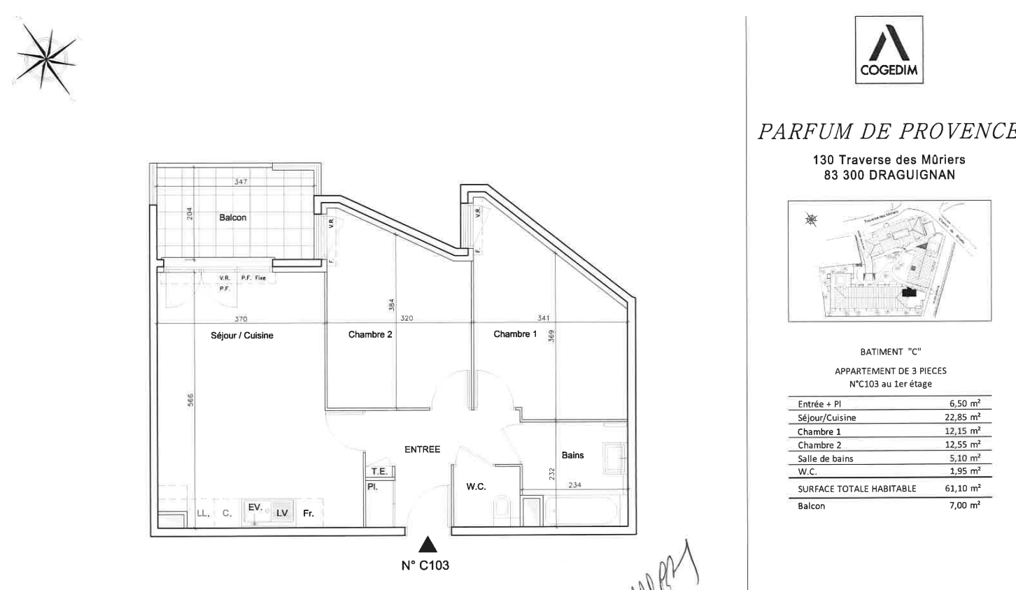C 103 - Dans une résidence récente PARFUM DE PROVENCE , un appartement 3 pièces de 61.10m² situé au 1er étage, composé d'une entrée avec placard, d'un séjour cuisine ouverte aménagée et semi-équipée de 22.85m² , de deux grandes chambres (12.15m² et 12.55m²) , d'une salle de bain et d'un WC séparé.