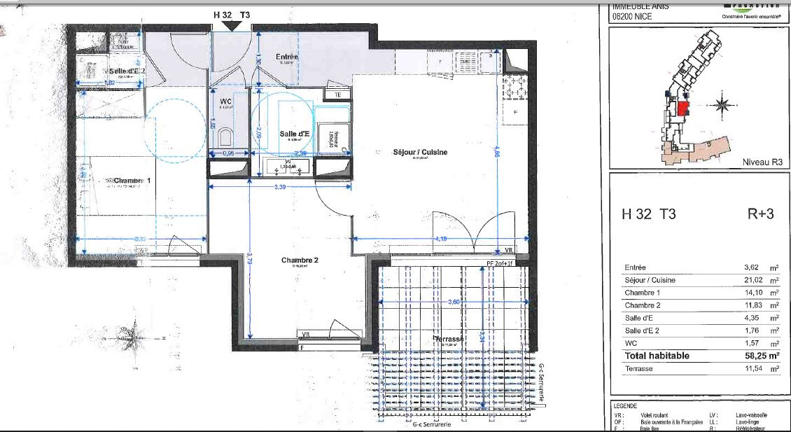 Au 03eme étage avec asenseur, appartement T3 NEUF DE 58.25M² comprenant une entrée , une cuisine aménagée ouverte sur séjour de 21.02m² , une suite parentale de 14.10m² avec placard et salle de douche , une chambre de 11.83m² une salle seconde d'eau, un WC indépenant. Belle terrasse de 11.54m² exposée Ouest ; Loué avec 2 parking sous sol.